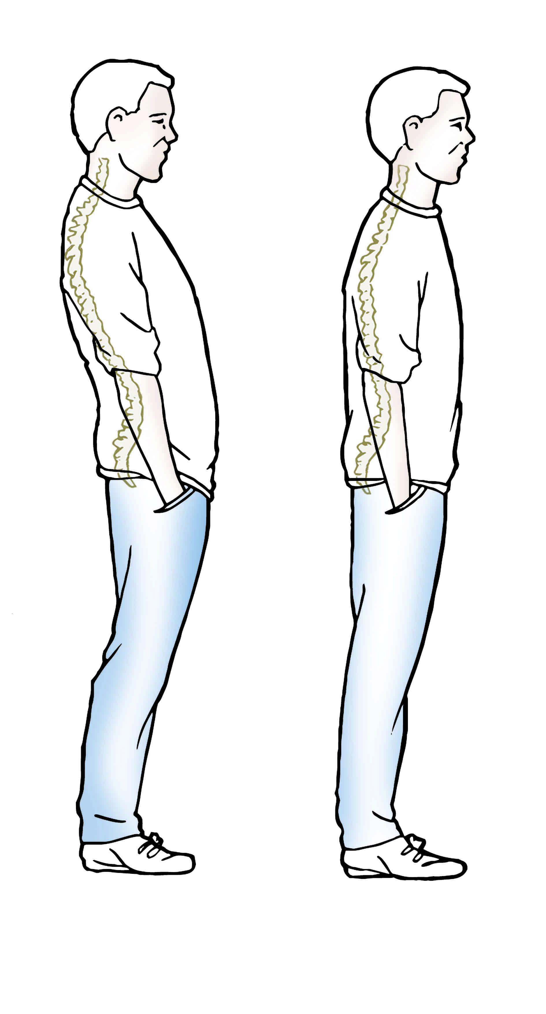How much do you weigh? Eight, 10, 12 or 14 stone? Whatever your body weight you need good support from your musculoskeletal system to stand without strain. In fact, humans are the only species that can stand in a fully upright stance, with flexible ankles and fully extended knee and hip joints. With our joints stabilised by ligaments, body weight is then efficiently transmitted into the ground through the bones of a double S-shaped spine, pelvis, legs and the platforms of the feet, notably without much need to use the body’s large, powerful muscles, such as the gluteals, thighs and calves. Intriguingly, as anatomists have discovered, this alignment allows a healthy person to stand for hours, swaying slightly, using only seven per cent more energy than while lying on the ground.